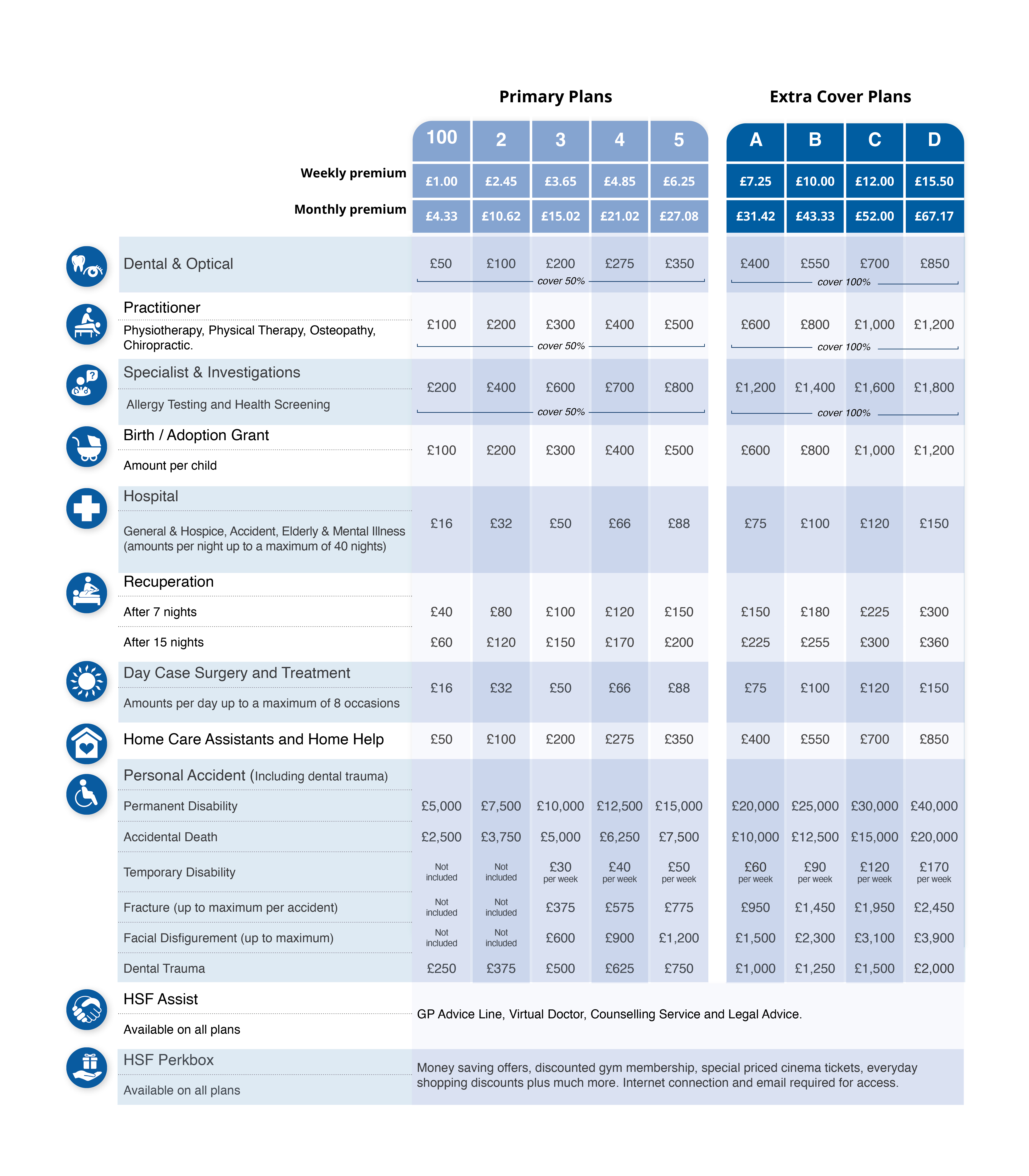 Our basic corporate plan starts from £1 a week, and if you want more benefits, you can simply increase your premium. Start saving today with HSF Health Plan.