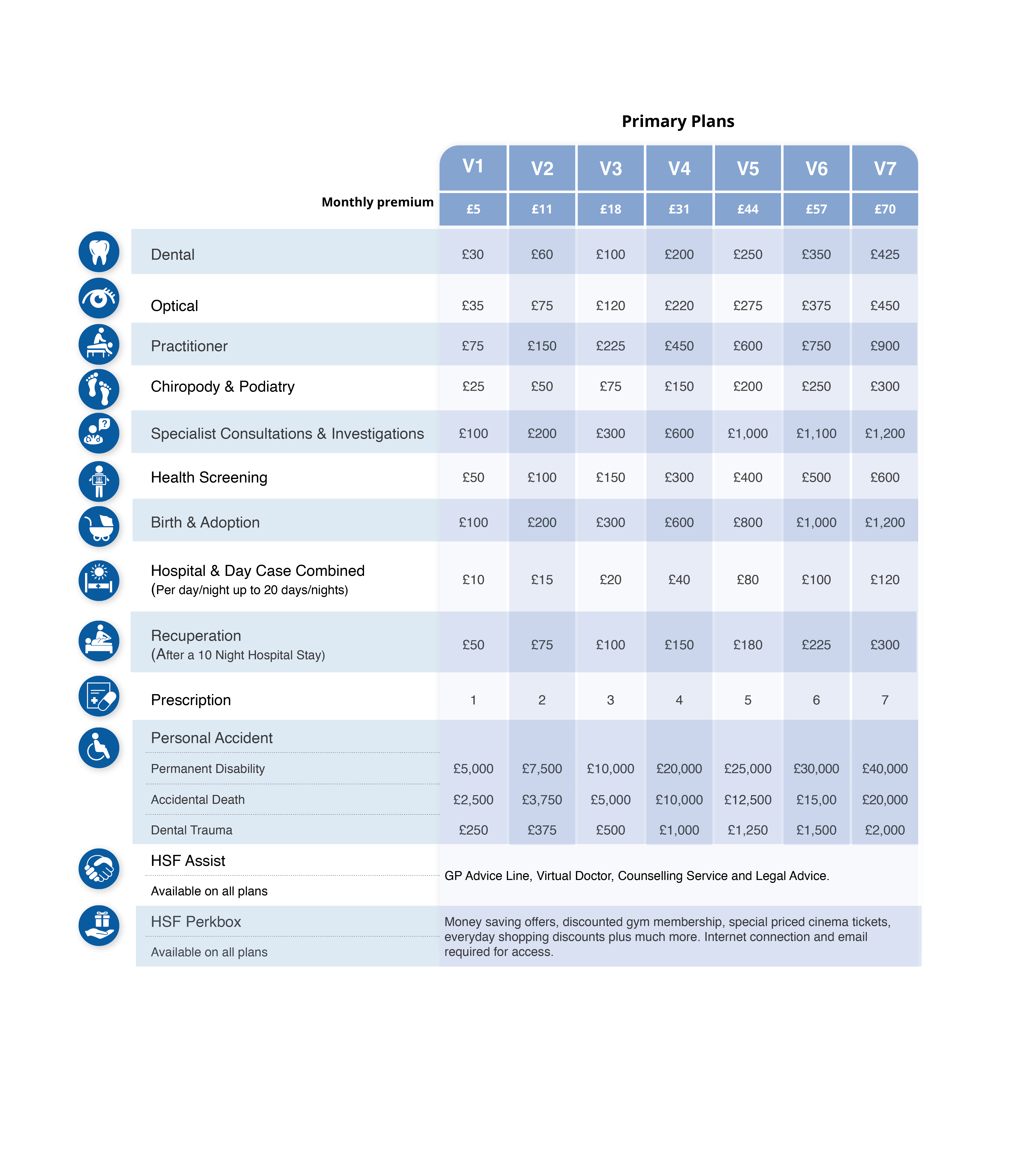 The Individual Health Plan starts from £5 a month (Scheme V1). You can increase your premium to have more money available to cover medical costs.